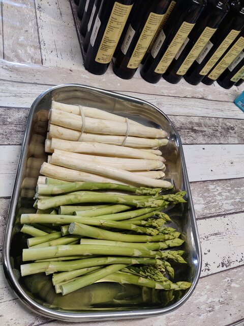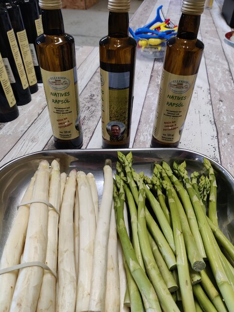 unser erstes Gemüse in 2005 ging es los, und lies uns nimmerlos. Auf 500000 m² spriesst er. Mal grün mal weiss. Wir Menschen ,werden bei ausreichendem Kontakt mit Sonnenlicht erst rot, dann dezent bis stärker braun. Beim Spargel ist das auch so. Unten, unter der Erde ist er weiss. Erblickt er die Sonne wird er erst rotbläulich ( lila) und dann schön grün. Ich mag Ihn am liebsten grün. Gebraten in Stücken in unserem Rapsöl mit Brot und Parmesan. Gut ein wenig Italien muss sein, wenn ich schon das Olivenöl verbanne. Aber auch den Weissen kann man braten. Man muss ihn nicht in Wasser ersäufen bis man Stricke draus drehen kann. Al dente heisst das Zauberwort, ach ich liebe Italien. Spargelanbau macht Arbeit. Viel Arbeit. Sehr viel Arbeit. Deshalb ist er teuer. Da hängt jede Menge Handarbeit dran. Jede Stange wird einzeln von Hand geerntet. Gewaschen ,sortiert , geschält,verkauft und von Ihnen zu Hause zubereitet und verspeist.